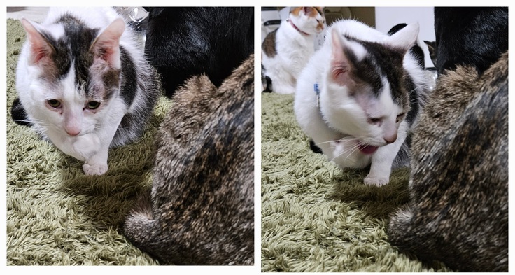 身体の不自由なゴマちゃんが初めて支え無しでペロペロお顔も半分までペロペロ出来ました❗とっても低い体制ではありますが、ゴマちゃんもまた1歩成長している...その姿にホッコリ...。