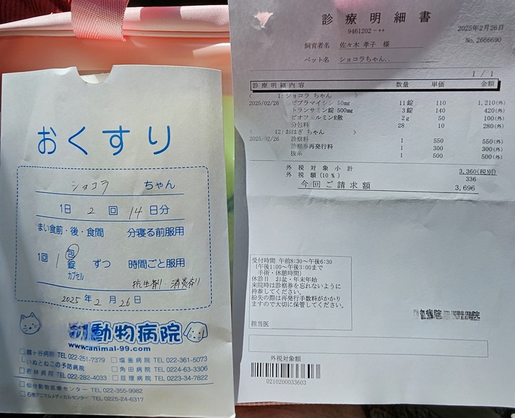 ソイくんの傷口も綺麗に回復中様子を見ながらのカラー外してokに、ショコラちゃんはお薬継続。3月から予約が始まる春の健康診断にショコラちゃん、シルクくんは予約をする事になりました。シニア向けのプレミアムコースになります。今日は抜糸とお薬(2週間分)だってので3696円でした!