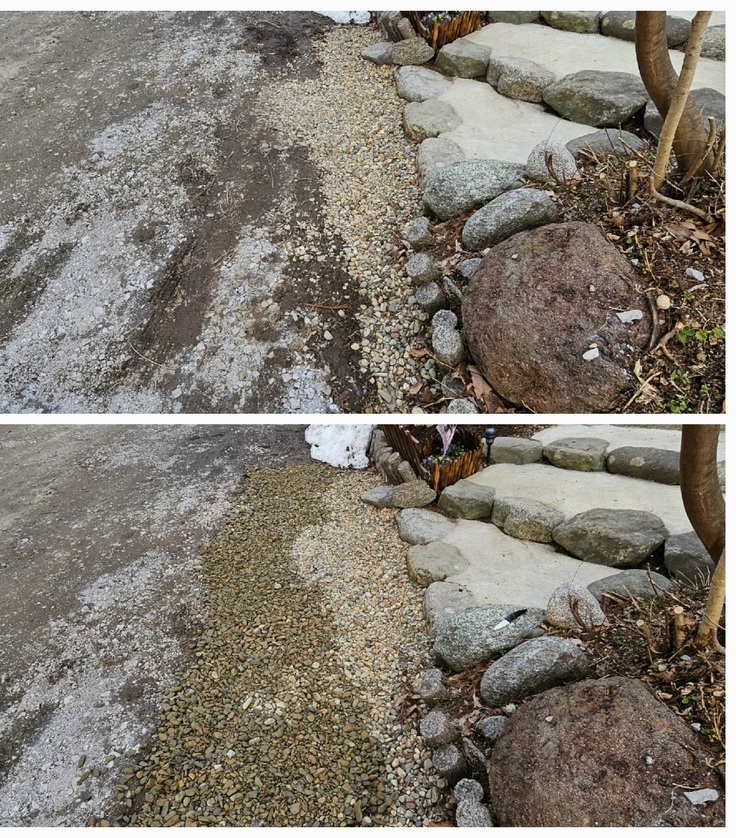雪の間何度か除雪車が通っていた為入口に敷いていた砂利が…雪がとけてみたら残念な状態に…追加で60kg敷きました。1袋20kg有り抱える事が出来ず引きずりながら…最後の1袋の時に段差から落とした袋が足に...思わずあー!痛いー❗大きな声で叫んでしまいました。