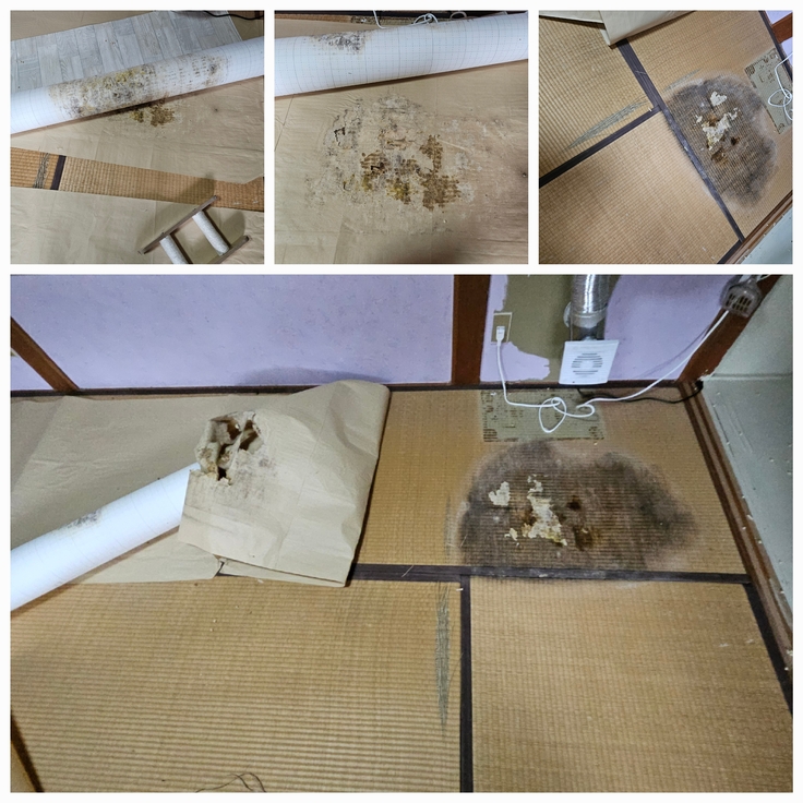 床のフローマットを剥がすと部屋中にカビの匂いが...畳も割けてしまっているところも…