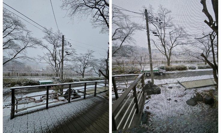 今日は大粒の雪…リビングの猫たちが冷えないように薪ストーブ、ファンヒーター、だるまストーブで…