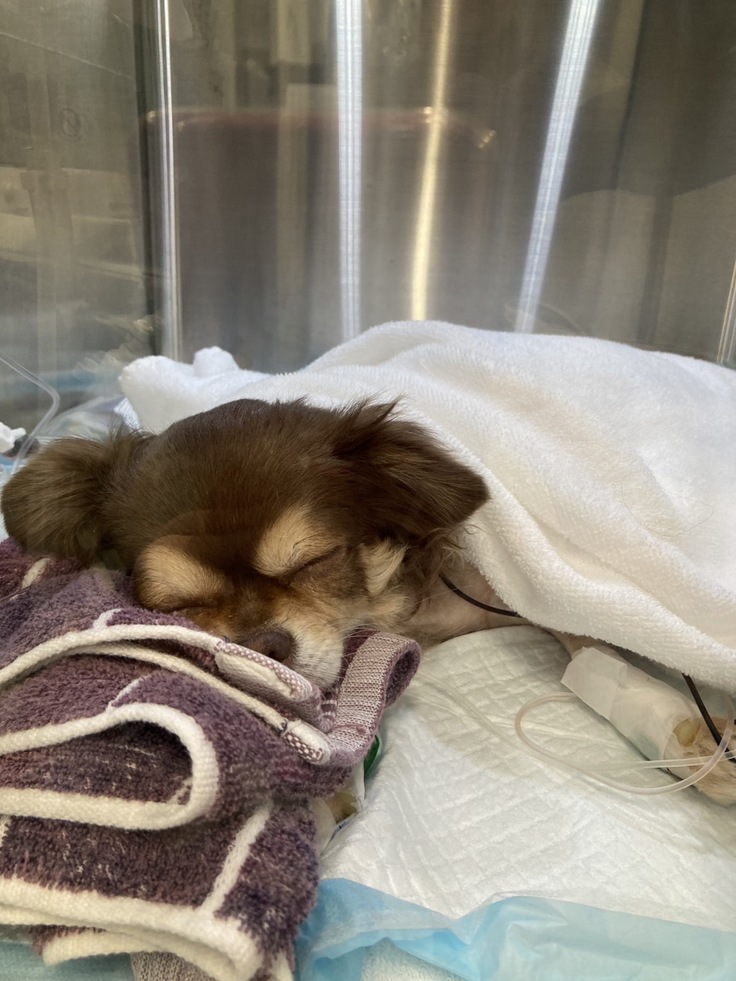 今はまだ酸素室に入っており、触れることはできません。名前を呼ぶと「クーン」と寂しそうな声で鳴いていました。早く抱きしめてあげたいです。