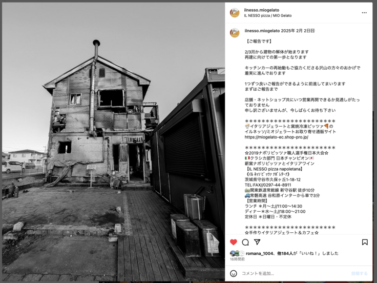 Instagram投稿では、現状のお写真や店主からのメッセージが掲載されています。