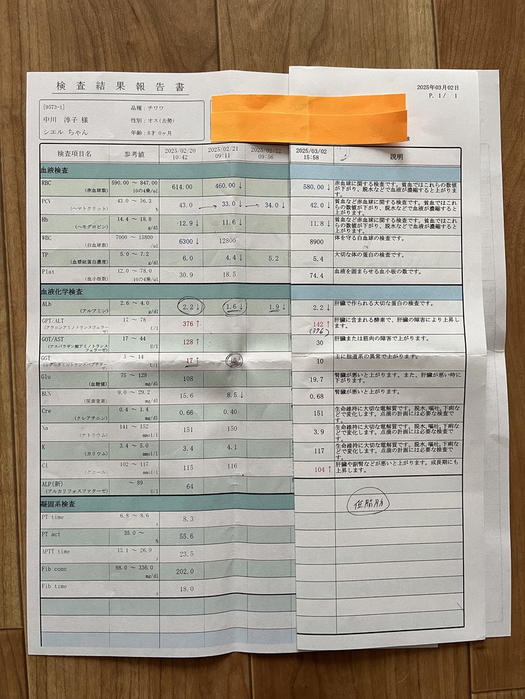 術前よりも数値が安定してきたとの事ですが、肝臓の数値がまだ高いので内服薬で様子を見ることになりました。