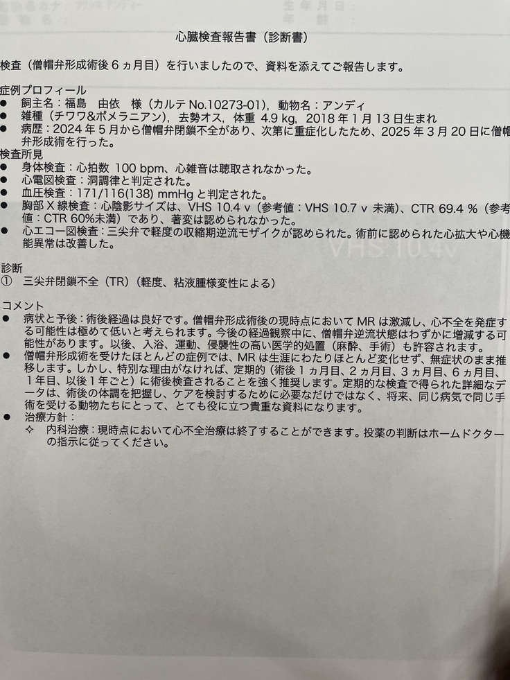 僧帽弁閉鎖不全症手術の術後6ヶ月検診に