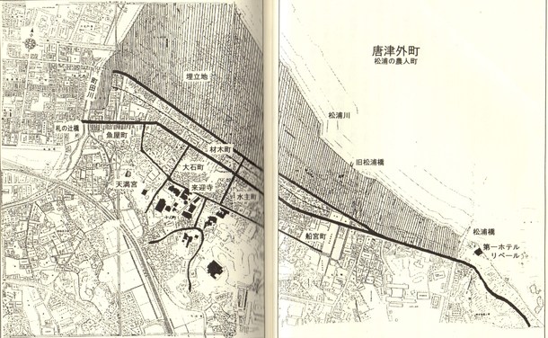 「この佐用姫岩から松浦川に沿って西へ向うと、二本の大通りが並んで走る。左が船宮町・水主町・大石町・魚屋町・右が材木町である。魚屋町から枝川である町田川に突き当たるところに、札の辻橋があり、ホテルから札ノ辻まで一・二キロ、これが唐津の下町の全長である」
