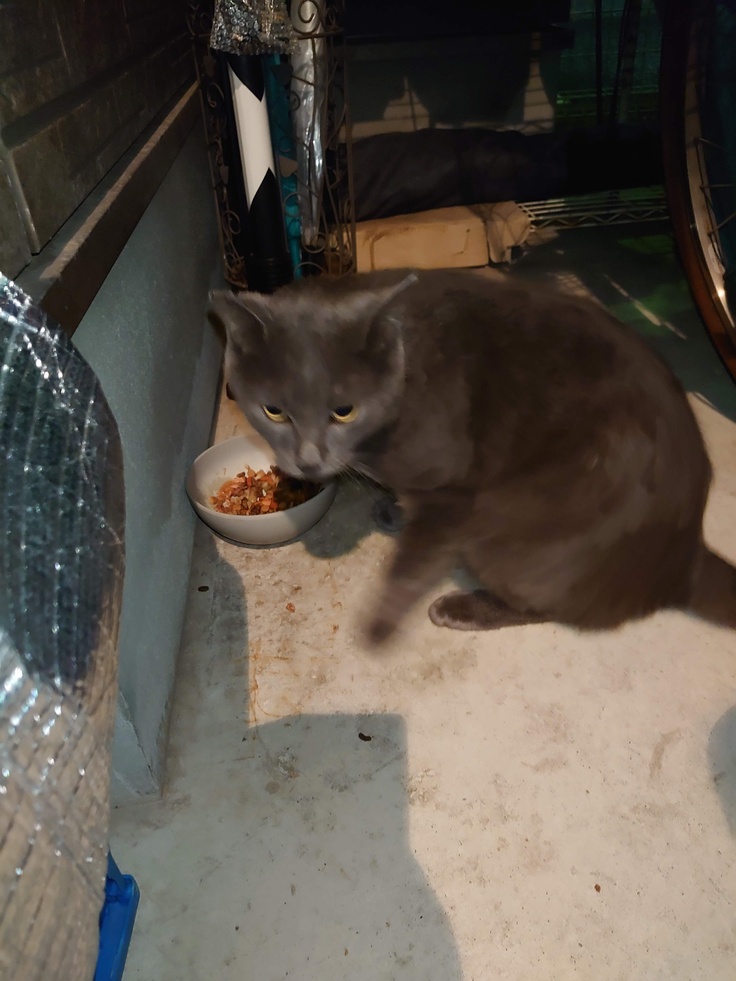 ロシアンブルーみたいで懐っこい仔です。知人はニャンコの協力者で餌場の提供と