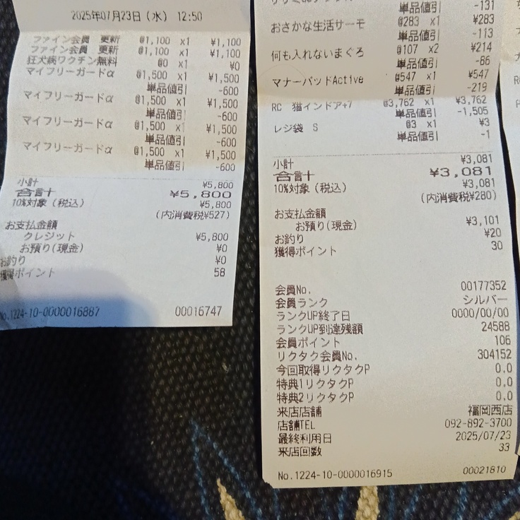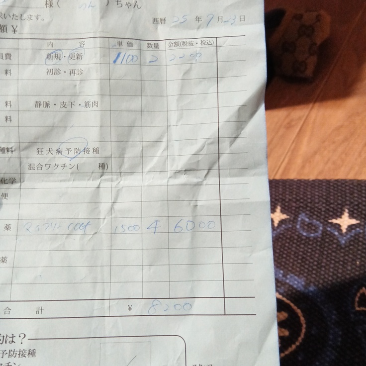 7月23日/8.000→動物病院会員価格ノミダニ駆除費5.800円