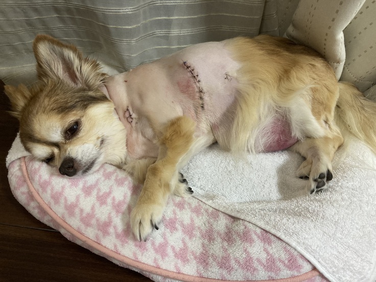 昨日から何も食べず今朝起きたら、お腹の赤みが強く呼吸するたびに震えていてすぐに手術してくれた先生と連絡をとりつつ、かかりつけの病院に行きました。お腹の赤みは血栓予防薬の影響、震えは炎症や痛みの可能性とのことで検査して頂きました。数値はそこまで悪くないとのことでしたがこの後もご飯が食べれないようなら手術した病院へ通院した方が良いとのことでした。食欲の出る薬を処方してもらって帰ってきました。家に着くと食べたそうな仕草がらあり、薬を飲まなくてもご飯が食べれました。少し安心しました💦