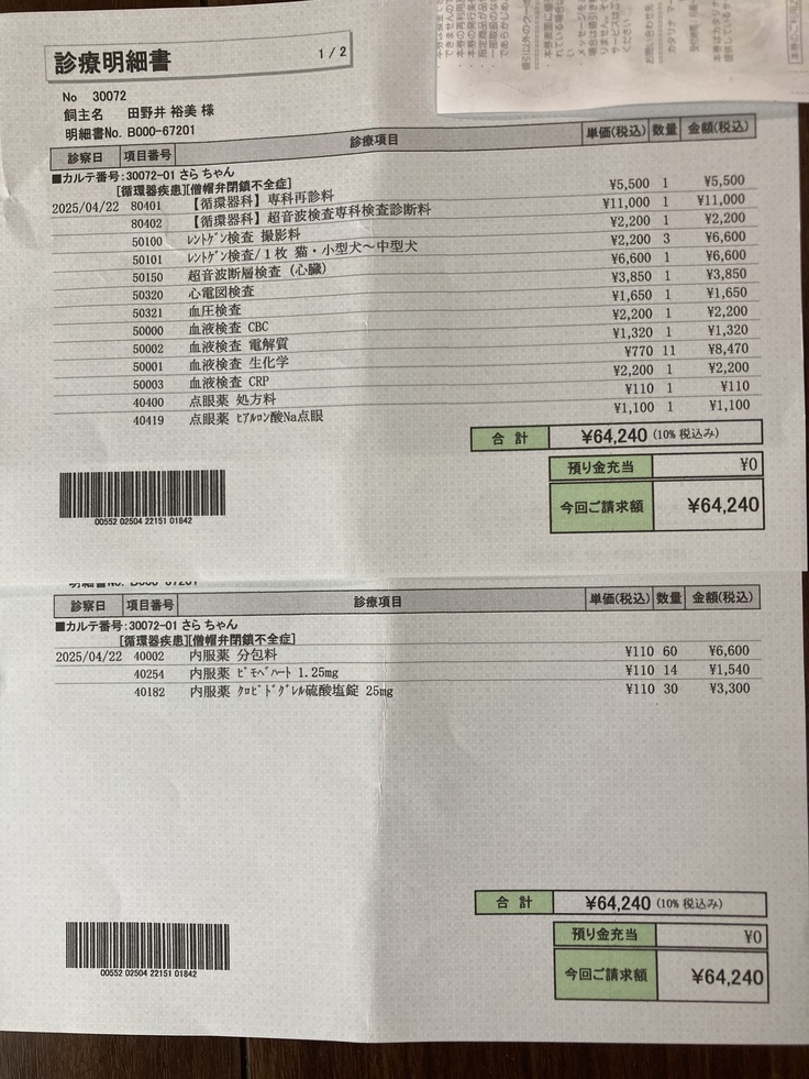 薬はシルデナフィル(血管拡張薬)は今日で飲み切り終了、ピモベハート(強心剤)は今日から2週間で終了、クロペドグレル(血栓予防薬)は3ヶ月検診まであと2ヶ月服用が必要。とのことでした。目薬(ヒアレイン)も処方してもらいました。