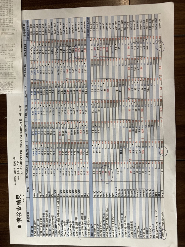 検査結果は大きくなっていた心臓が基準範囲内でに収まり、心電図でも不整脈なし、炎症の数値も落ち着いていました😊腎臓の数値は高めで、血小板の数値は今服薬している薬の影響で高めで、どちらも経過観察。