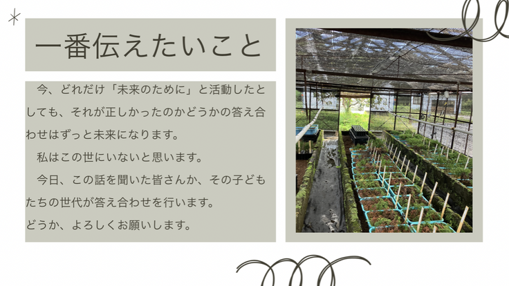 現在行なっている里山保全活動などは、その効果が現れるまで長い年月を要します。