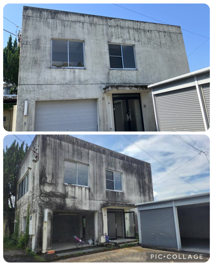 黒ずみ、ツルが沢山這っていた外壁のツルの除去と全面の水洗いがひとまず終わりました。