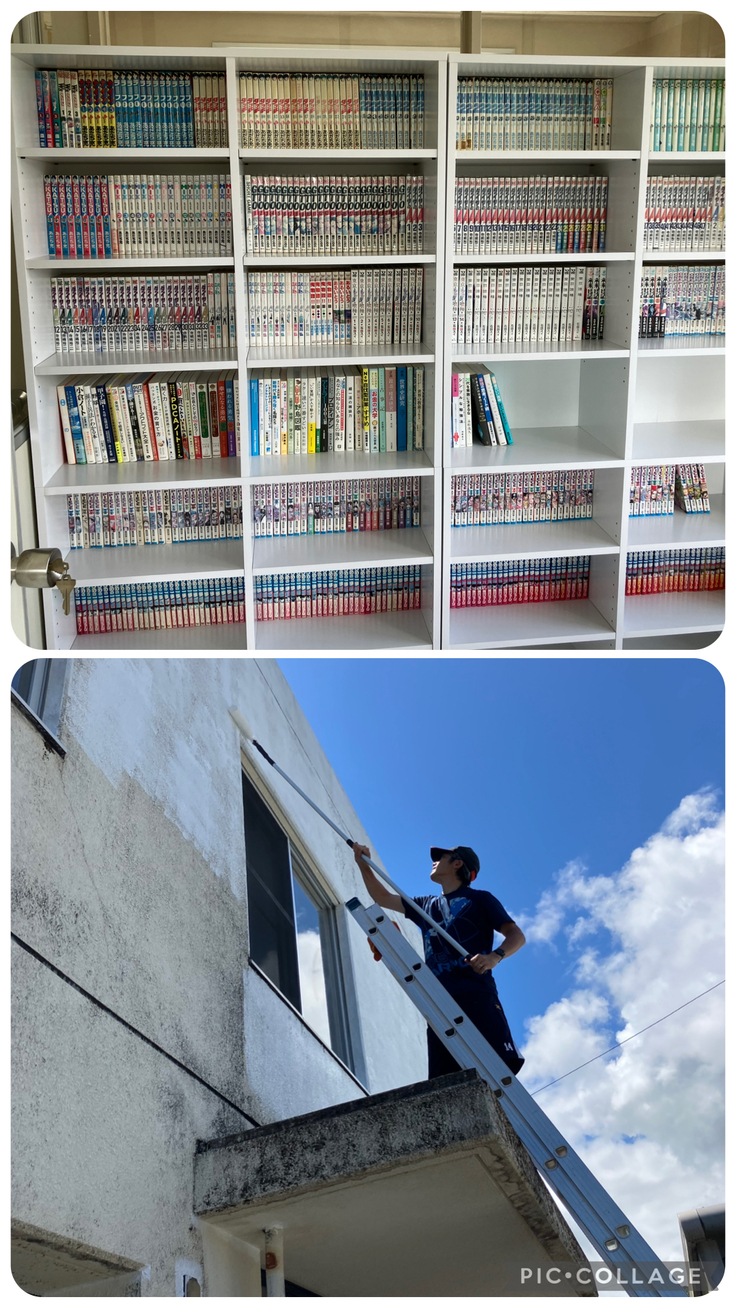 ①カフェスペースに書庫を整備しました。