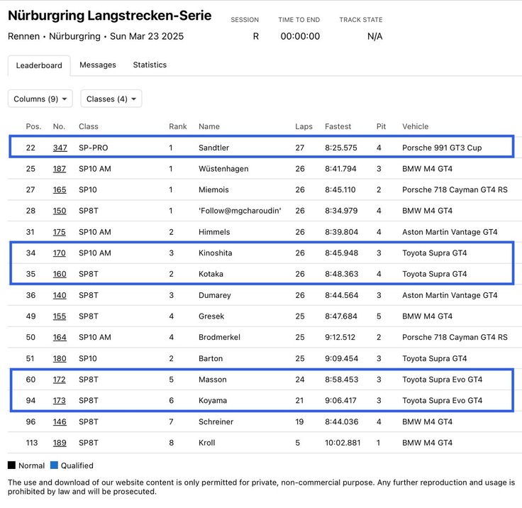 つまり、スープラGT4が、BMW・M4GT4やポルシェケイマンGT4や、あるいはアストンマーチンGT4より遅いってことです。このあたりはトヨタに頑張ってもらわねばなりませんね。