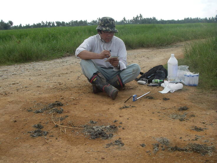 半島マレーシアでの最初の調査はカワウソ研究グループとして2000年から2001年に行ったスマトラカワウソ生息確認のための調査です。野生生物国立公園局のブハヌディン氏と、ペラ州とパハン州の泥炭湿地林で、車を用いたセンサス、自動撮影装置による調査などを行いましたが確認できませんでした。佐々木が在外研究として2010年度に客員教授としてマレーシア国民大学(UKM)に滞在し、糞を全国で採集して糞DNAから種判定を行って分布を調べ、スマトラカワウソは交通事故死体の確認による調査を行ないました。この調査からDNAを扱うようになり、九大の関口猛氏、東農大の和久大介氏、UKMのシューコール氏とバドゥルル氏、野生生物国立公園局のブハヌディン氏とパジル氏との共同研究となっていきます。2015年からペラ州の水田地帯でコツメカワウソとビロードカワウソの種間関係の調査を開始しました。毎朝、新鮮な糞を採取し、糞から種判定、性判定、個体識別を行うという研究です。水路によって種が変わるといったことまでは順調に調査が進んだのですが、現地のラボでの分析がうまくいかず停滞している間にコロナ禍となり、停電のためディープフリーザーが止まり、抽出した糞DNAが全て失われるという悲劇が起こりました。2019年からはコツメカワウソとビロードカワウソの雑種の研究を開始し、手法の開発から着手しました。トゥンフセインオンマレーシア大学(UTHM)のラティフ氏が研究チームに加わり、2023年度はペラ州、セランゴール州、ジョホール州で、2024年度はジョホール州で調査を行い、マレーシア国内に雑種が広がっており、ジョホール州では特に多いことが確認できました。また和久氏が糞に含まれる餌動物のDNAから食性を調べる研究を2023年から2024年に行なっています。