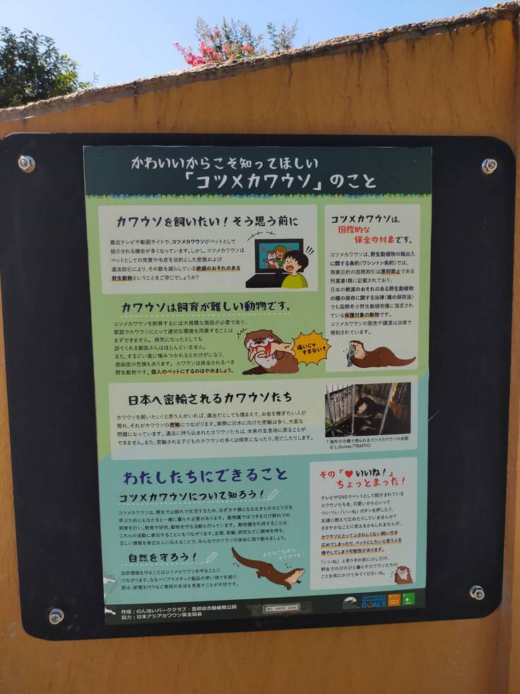 豊橋総合動植物公園のカワウソ舎には、当協会と協同して作製したパネル「かわいいからこそ知ってほしい、コツメカワウソのこと」も掲示されています。