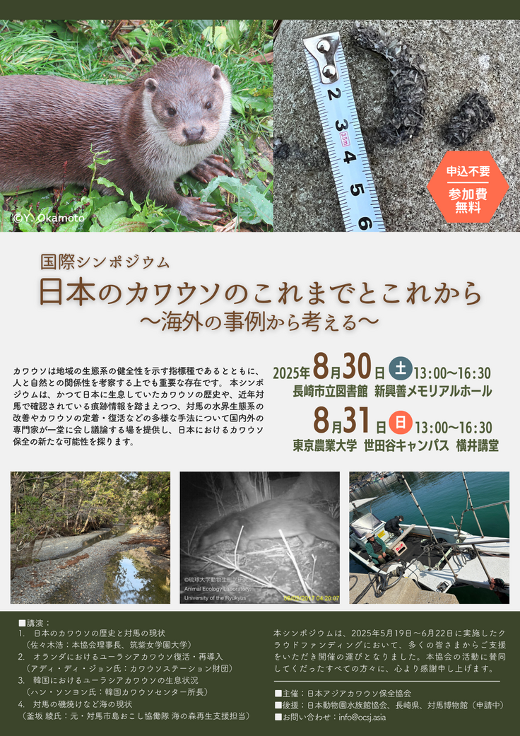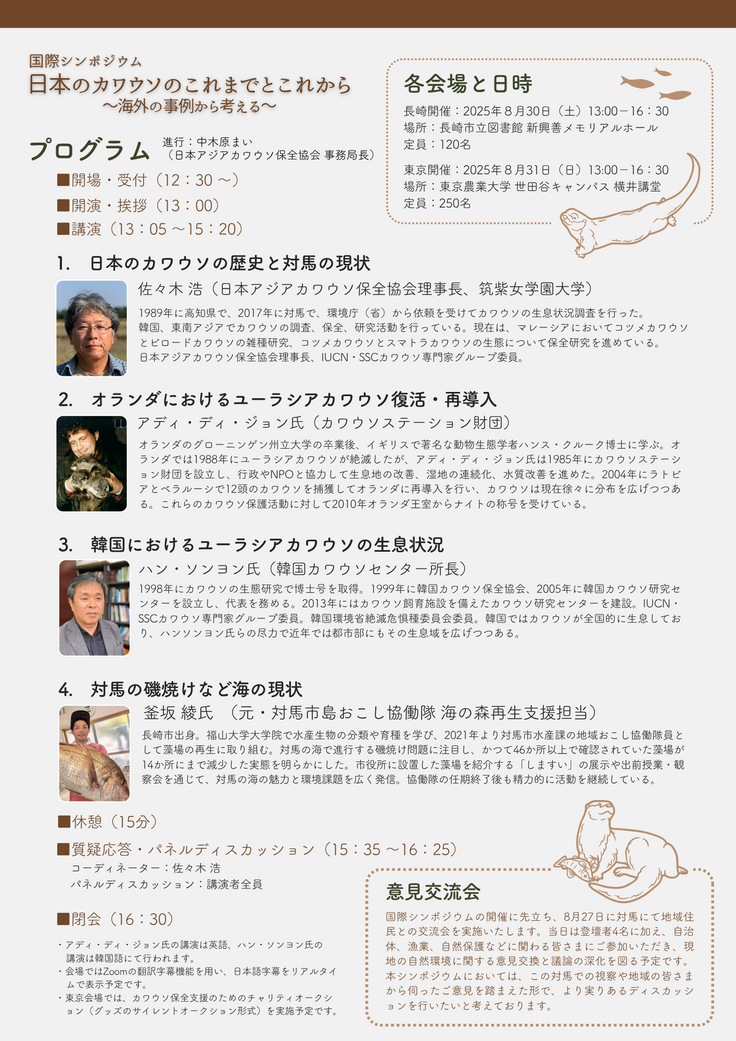 本シンポジウムは、対馬での生息状況、一度絶滅したカワウソを復活させたオランダの実例紹介、対馬のカワウソの元の個体群と考えられる韓国のカワウソの生息状況、対馬の磯焼けなどの現状などを紹介し、カワウソの復活に向けて議論する場を提供し、対馬の生態系、生物多様性の保全について考えるきっかけとなればと考えております。