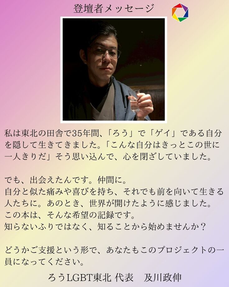 小学生の頃に男性への想いに気づくも、「ホモ」「おかま」と揶揄される中、誰にも言えず孤独を抱えて生きてきた。ろうでありゲイというダブルマイノリティとして、自分を偽る日々に限界を感じ、心を閉ざしたこともあった。