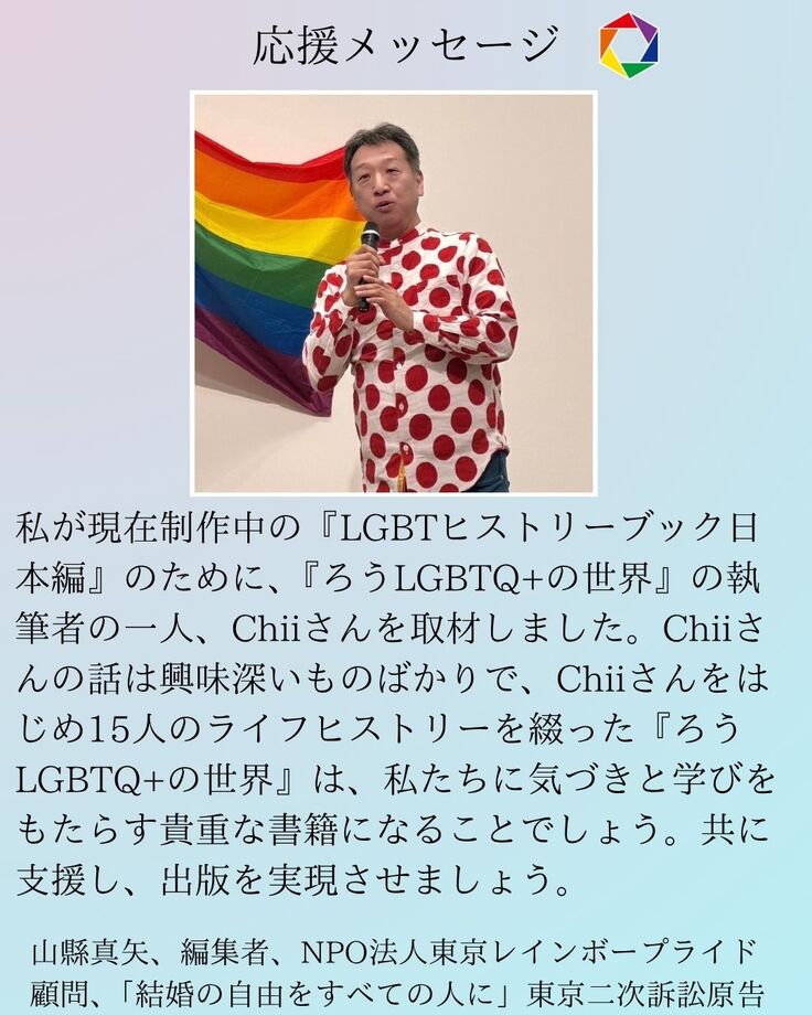 私は長年、東京のプライドパレードの運営に携わってきましたが、Chiiさんの話を聞くまで、パレードへの参加をはじめ、90年代のTLGDCの活動についてまったく知らなかった自分を恥ずかしく思い、当時の活動のこと、そしてLGBTQ+のろう者を取り巻く現状について、もっと知りたいと望み、また、記録としてきちんと残さなければいけないと思いました。ぜひともクラファンを成功させ、『ろうLGBTQ+の世界』の出版を実現させましょう。」