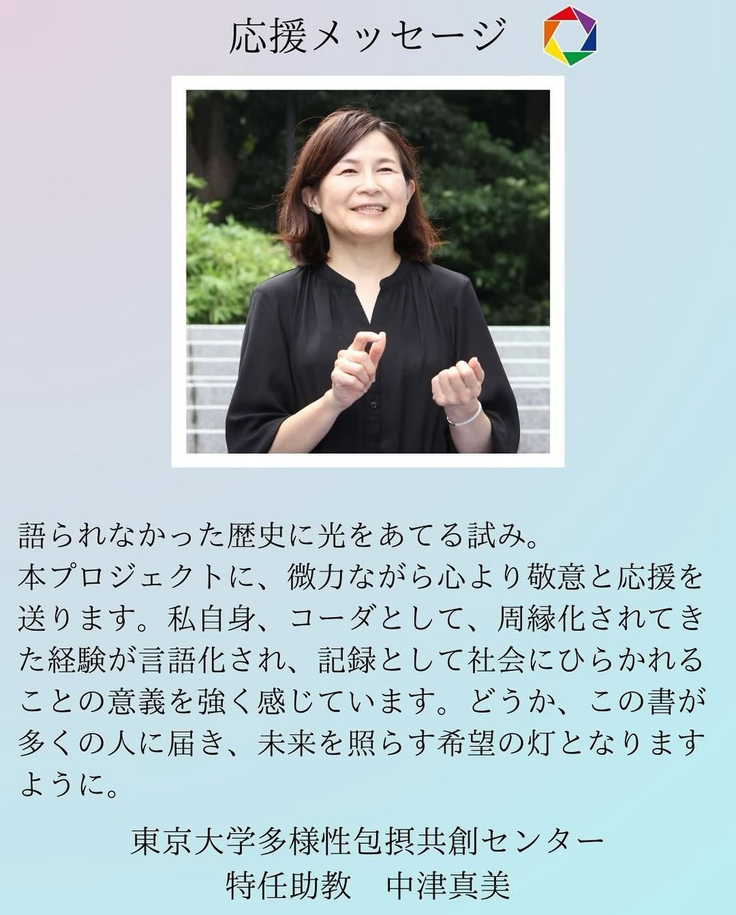 東京大学 多様性包摂共創センター 特任助教、中津真美さんより、心強い応援メッセージをいただきました。どうか最後まで見守り、そして広めてください。