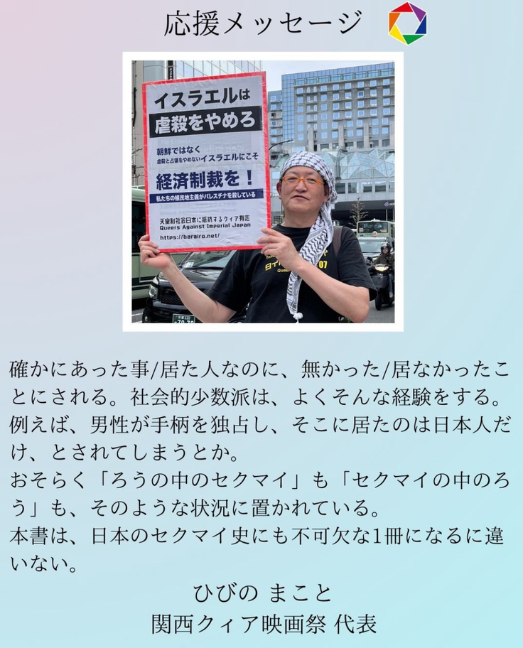今回は、関西クィア映画祭 代表のひびのまことさんより、応援メッセージをいただきました。(39人目)