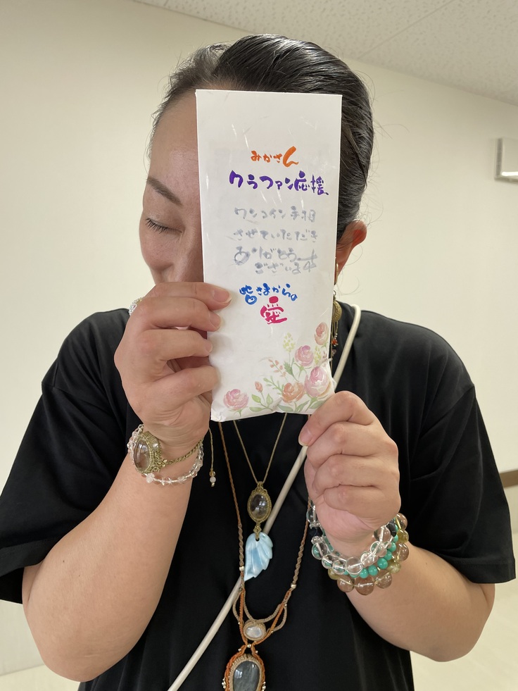 沢山のイベントで集めて下さった支援金をいただきました(写真は素敵なメッセージをかいた封筒をもつゆかりさん)