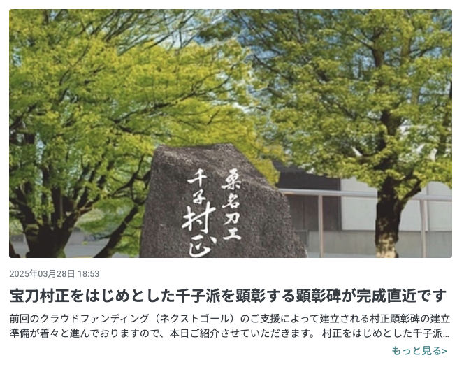 また、前回のクラウドファンディング(ネクストゴール)のご支援によって建立される村正顕彰碑の建立準備も着々と進んでおります。