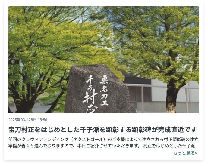 さらに「妖刀」ではなく「皆に愛された刀」として村正を100年、200年先へと伝える顕彰碑に相応しい仕様になっていくと感じています。引き続き進捗についてご報告できればと思いますので、どうぞお見守りいただければ幸いです。