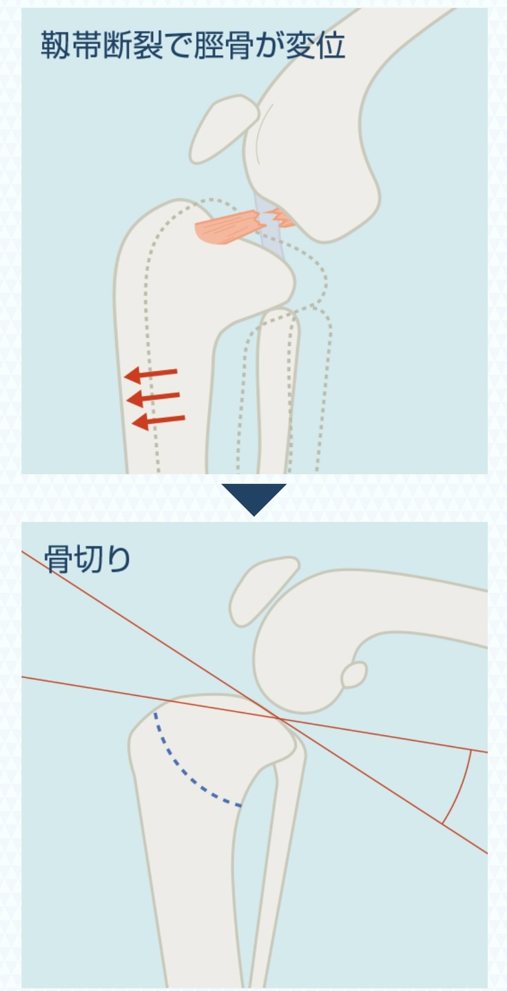 前の靭帯が切れると後ろに骨がずれる。これを骨を切ってボルトで止めたら,歩けるようになるのがまだよくわかってない。小型犬ではやらずにおくという判断もあるみたいだが大型犬は重いので、この手術をする他ないのだ。