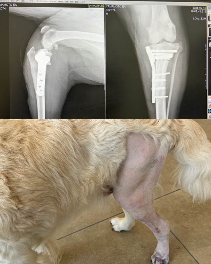 腫れが引いて毛が生えています。着足もできていて歩行もできます。