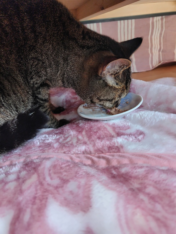 工場保護猫ハウスのおかかちゃん、少しですが、自分でご飯食べてくれています😂