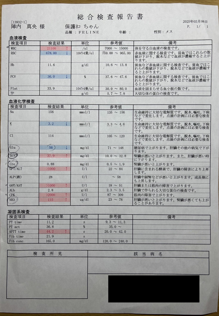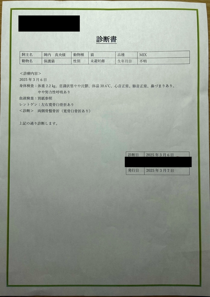 ※保護からすぐの受診のため,診断書には保護猫と記載。3月7日以降に名前が決定。