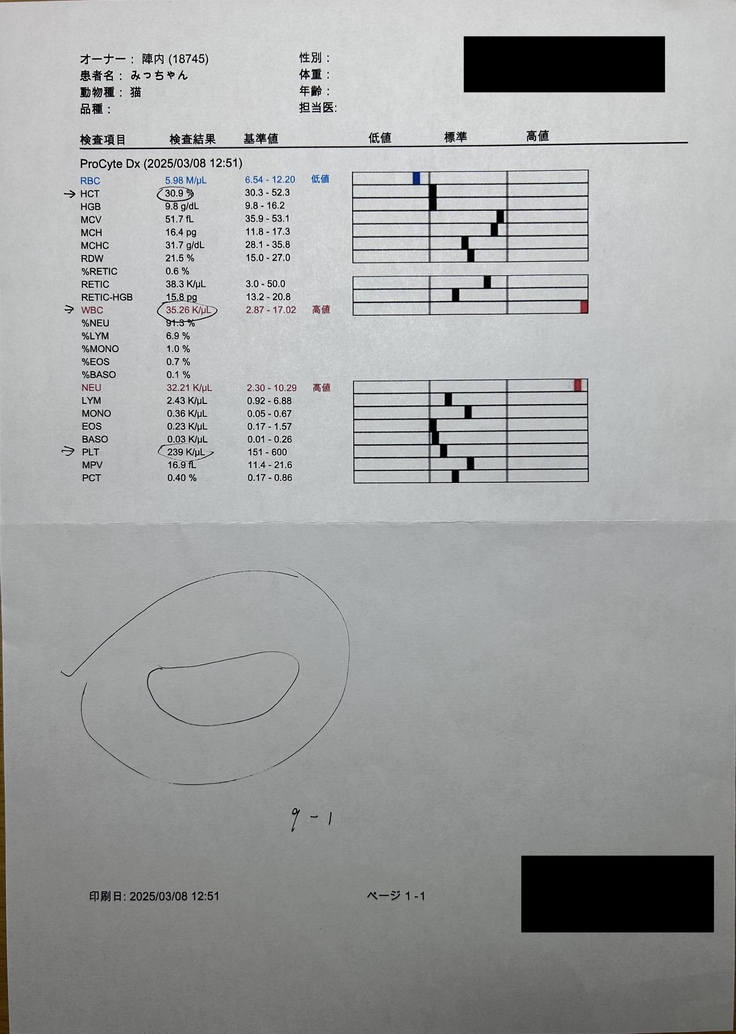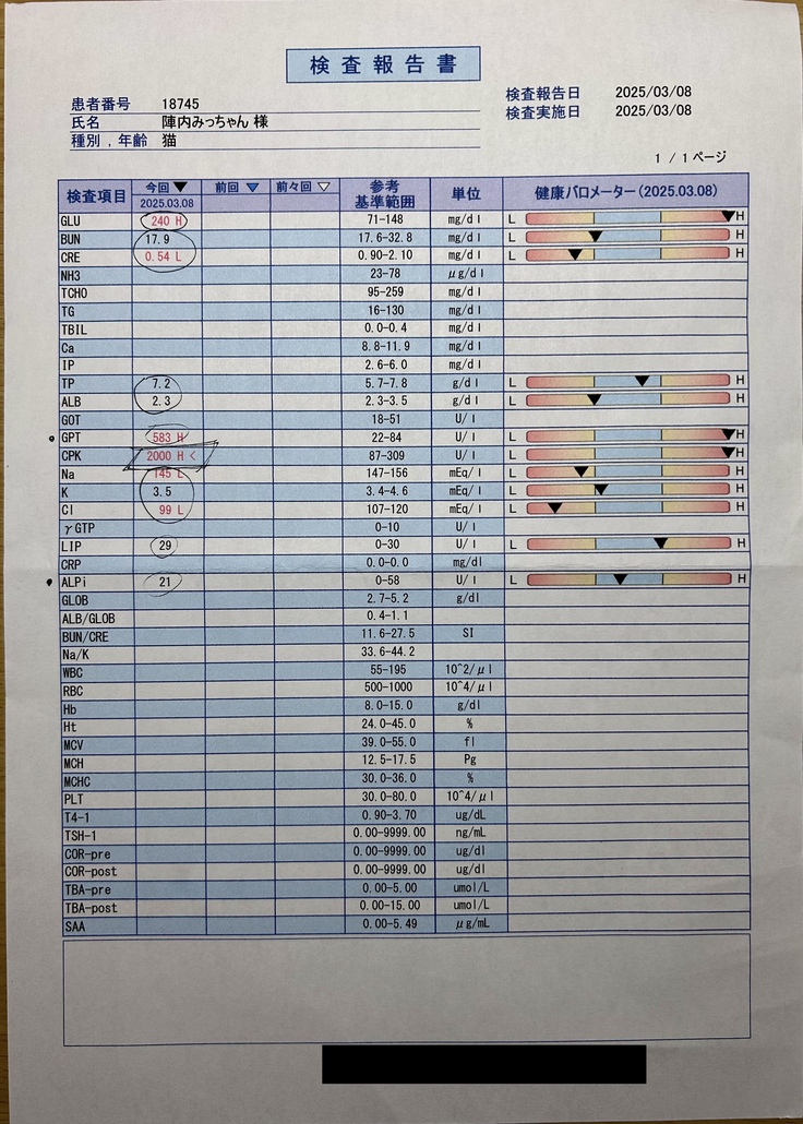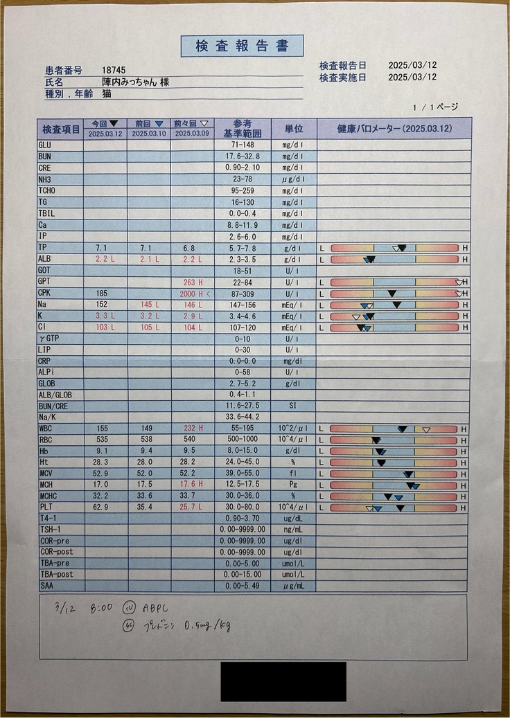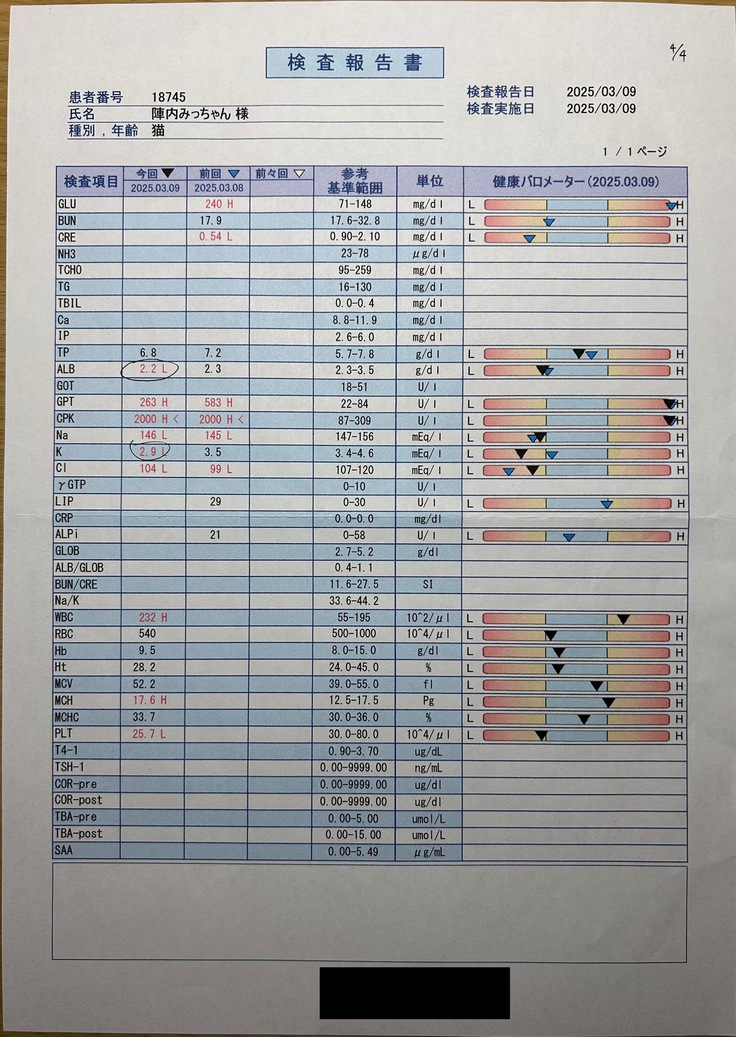 幸いにも3月8日の血液検査では,わずかながらも内臓機能が安定する傾向を示しました。