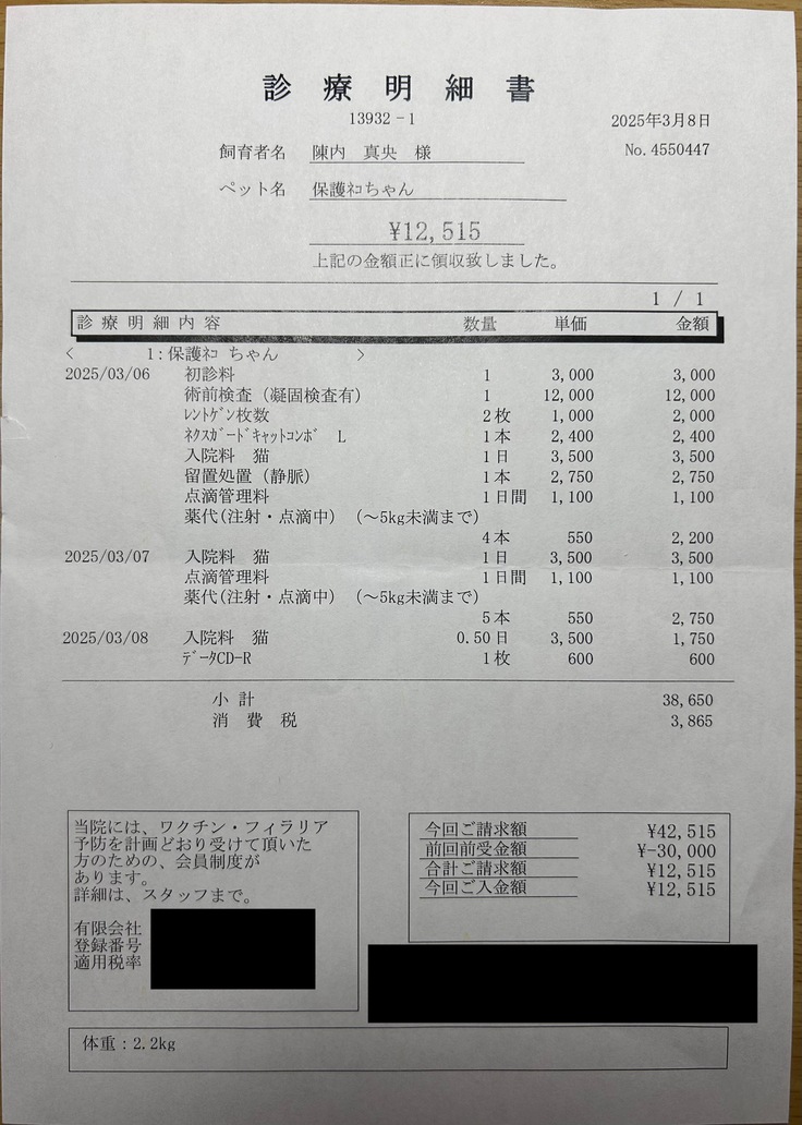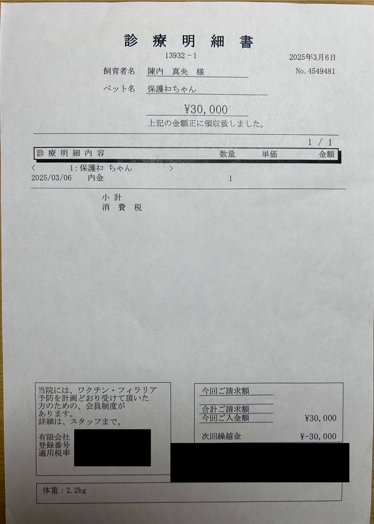 1.ペット保険:野良猫のため加入なし,全て実費です。