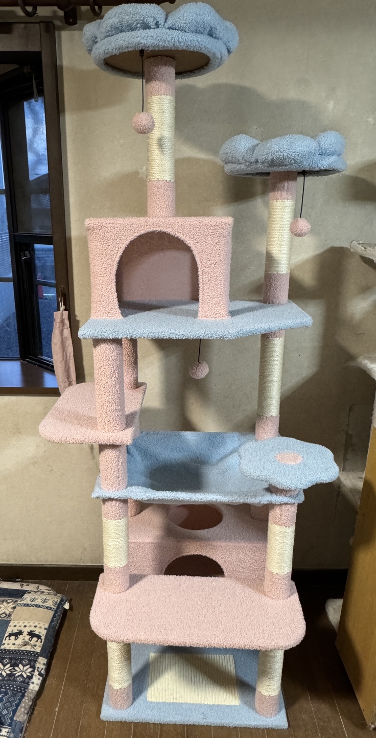 1階組は遊ぶところが少ない為、キャットタワーをもう1つこちらに設置しました。あと1つ届く予定ですので、そちらは2階に設置したいと思います。