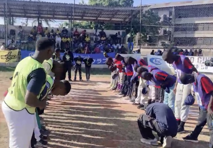 写真 「タンザニア甲子園大会」にて、プレイボールとゲームセットの挨拶が行われている様子。