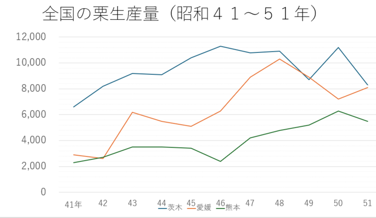 表1では愛媛県では昭和48年には1万トンもの生産量を誇っており翌49年には栗の生産量日本一になった輝かしい歴史があります。