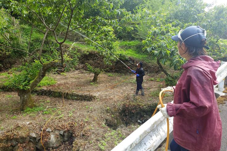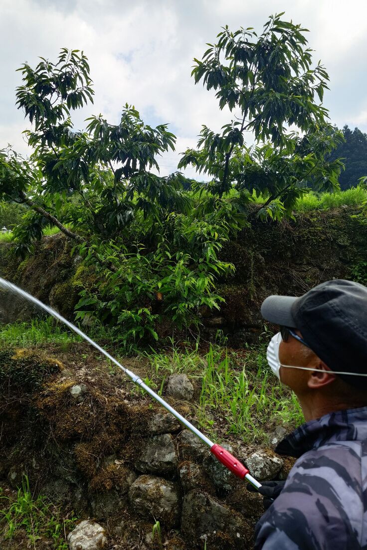早朝から、防除作業を徹底して行っています。これは、小さいうちに虫に食べられたり、病気にかかったりして栗の赤ちゃん毬が落ちててしまわないようにするためです。