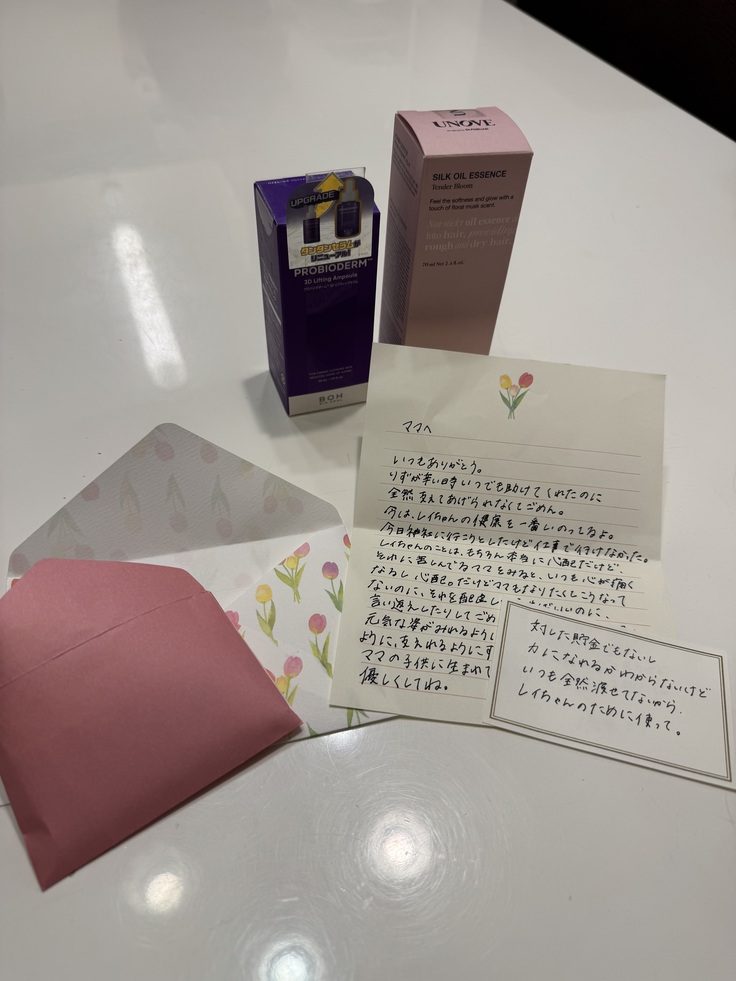 今朝起きたらテーブルに私の大好きな美容グッズとお手紙とレイちゃんの為に使ってと沢山のお金が置いてありました。