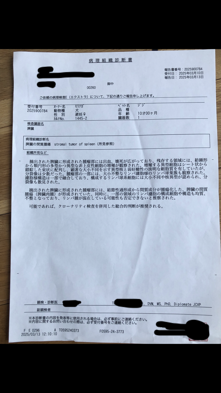 結果は、脾臓の腫瘍が破裂したことにより、血が止まらなくなったことでした。