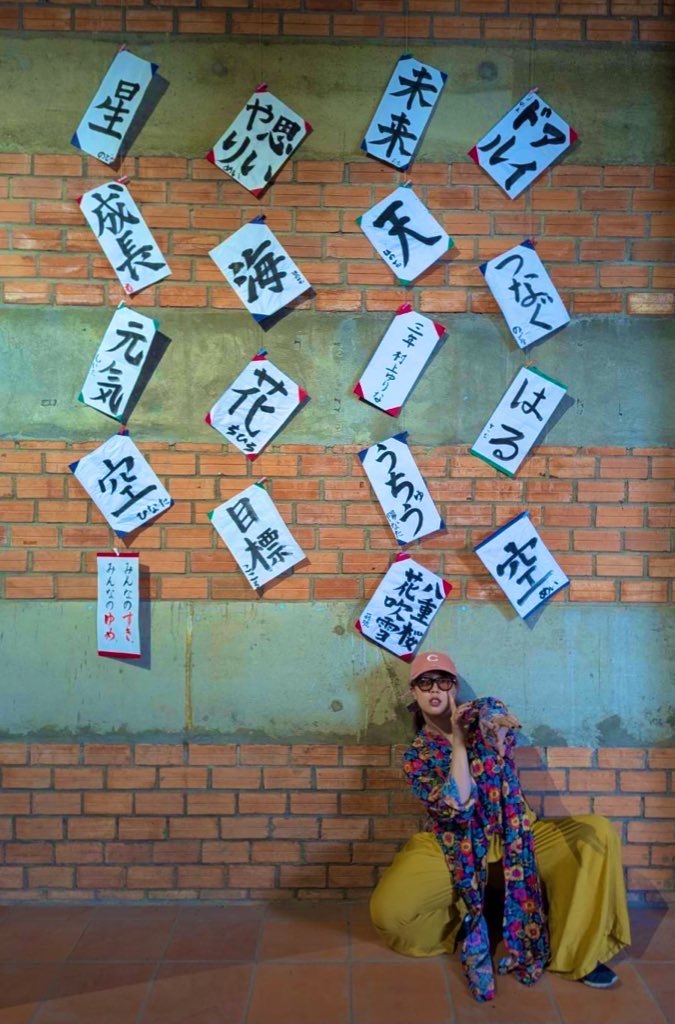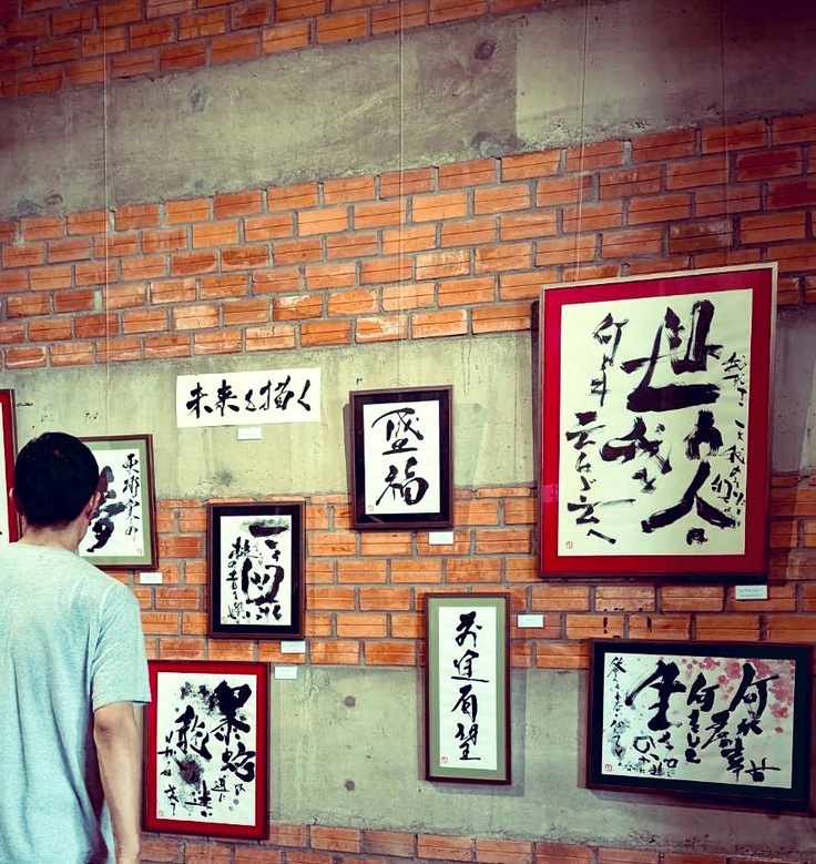 展示初日は、今回の出展者でありベトナム在住の、西風じゅんさんと古賀睦基さんがいらしてくださいました。ホーチミンで書道教室の先生をやっていらっしゃる西風さんはお教室の子供達の作品を、書道家の古賀さんにはご自身の作品を出展頂いています。