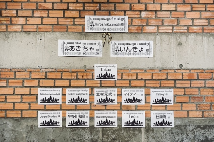展示会場にお名前を書いて掲載いたします。掲載可能は文字は、日本語、クメール語、ローマ字、記号10文字までです。企業名、屋号、ニックネーム、イニシャルも可能です。
