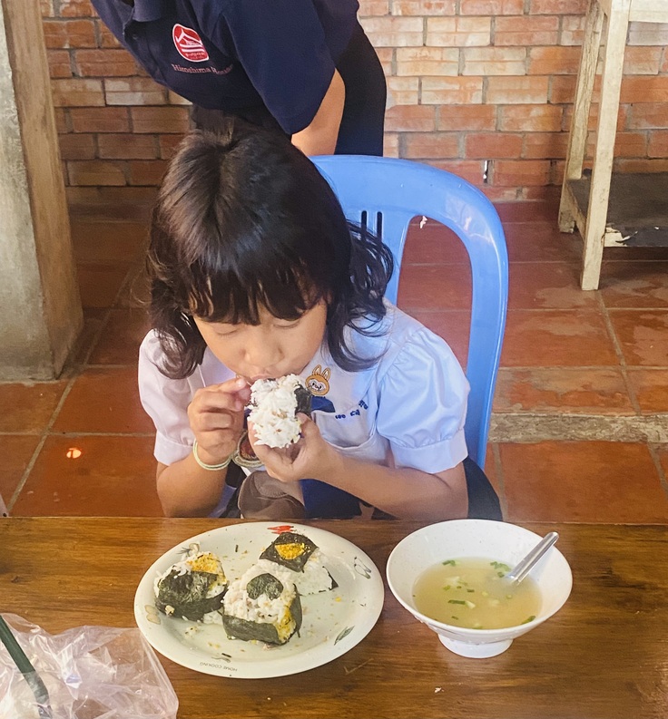カンボジアは日本ほど、素手で食材に触れる概念が無いので、お米をプレスして三角形をつくるオニギリキットを使います。