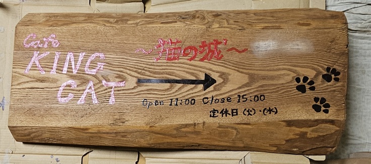 業者様より頂いた板にヤスリをかけ、保護材塗装しペンキで書きました。1部失敗した所はヤスリがけ、もう一度保護材を塗ってくいをつけて完成です!