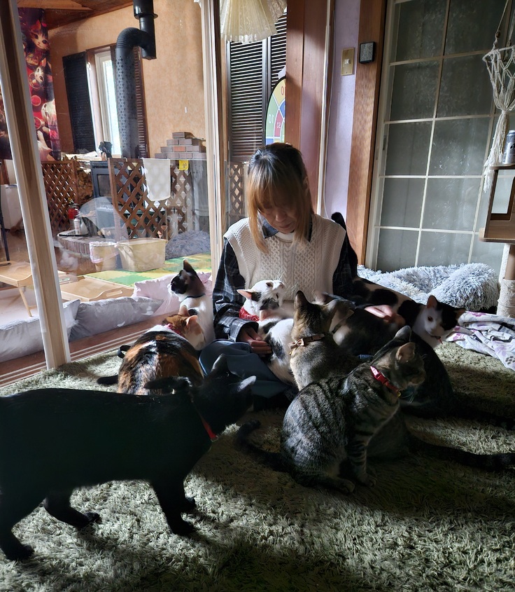 急いで帰り猫たちのお部屋へ入るとみなが集まり甘えん坊に…