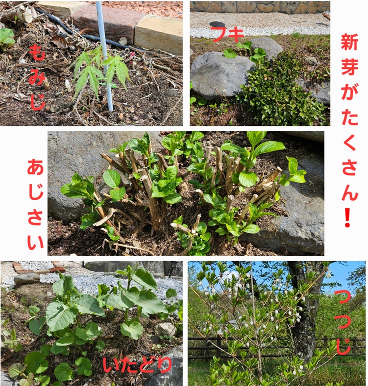 綺麗に...数年手入れがされておらず、カビや苔たらけだったツツジやアジサイも根が生きていたので青々と新芽が沢山出て来ました。モミジの芽も出て来ました。