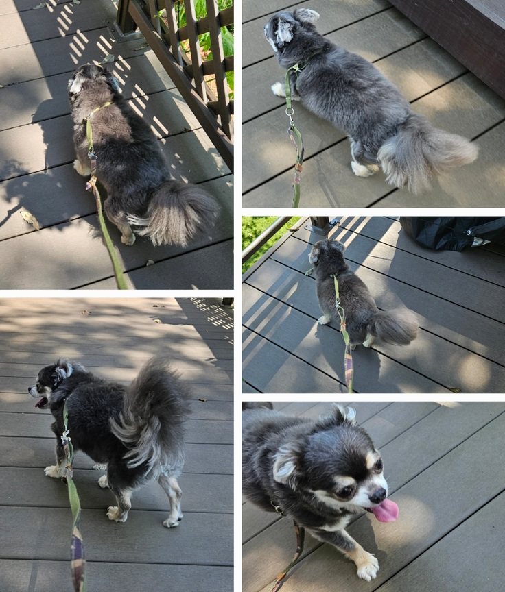 小太郎くんは暑いのでウッドデッキが日陰になってからお散歩…