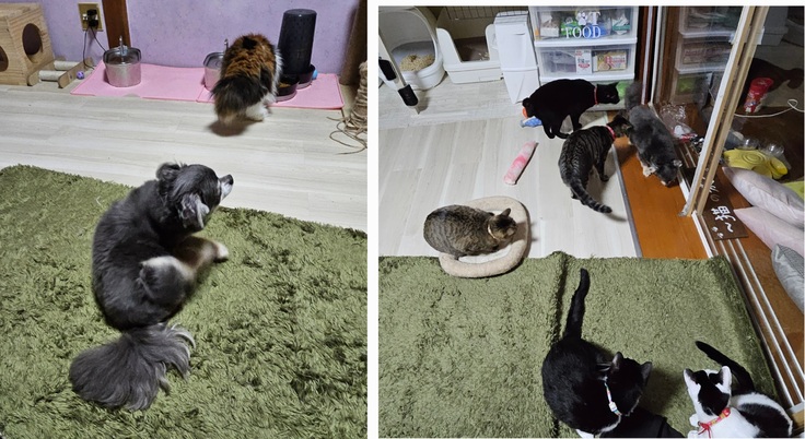 お迎えした🐕️の小太郎くんと🐱たちだいぶ距離が縮まりました❗