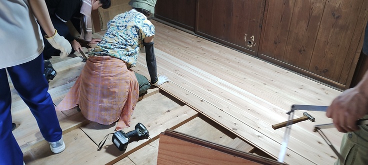 午後からはプロの大工の方を含む地域の応援メンバーも加わり、本格的な床板貼り作業を行いました。隅の調整も丁寧に行い、無事に1部屋分の床板が完成しました。